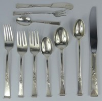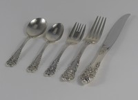 11 - 137pc REED & BARTON CLASSIC ROSE STERLING FLATWARE One hundred and thirty seven pieces of Reed & Barton sterling silver flatware in the 'Classic Rose' pattern. Each piece marked Reed & Barton, Sterling, Classic Rose. Includes a main service consisting of 121 pieces plus 16 serving pieces. 12 dinner forks-7 1/4", 24 salad forks-6 5/8", 12 oval spoons 6 3/4", 12 teaspoons-6", 12 iced tea spoons-7 1/2", 13 cocktail forks-5 3/4", 12 demitasse spoons-4 1/2", 12 solid butter knives-6", 12 handled dinner knives-9 1/8", 1 handled carving fork-11", 1 handled carving knife-13 3/8", 1 handled master butter-6 7/8", 1 handled cake pie server-10 5/8", 1 handled server-7 1/8", 1 ladle-7", 2 serving forks-8 1/4", 2 serving spoons-8 5/8", 1 pierced tablespoon-8 5/8", 1 lemon fork-4 3/4", 1 salad serving fork-9", 1 salad serving spoon-8 7/8", 1 sugar spoon-6 1/8" and 1 jelly server-6 1/2". Total approx sterling weight 156.8ozt including 148.3ozt weighable silver + approx 8.5ozt handled pieces.