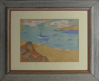 13 - HERMAN MARIL 'INLET WITH BOAT' WATERCOLOR PAINTING Herman Maril (American, 1908-1986) watercolor painting on paper depicting a coastal scene with small boat. Signed lower right. Viewable measures 13 1/4" x 9 7/8".
