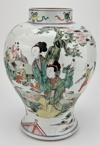 16 - CHINESE FAMILLE VERTE PORCELAIN GINGER JAR Chinese Famille Verte porcelain ginger jar. Depicts figures playing games in a courtyard scene. Blue double circle to underside. Measures 13 1/2" height x 10" x 10".