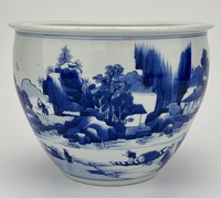 27 - CHINESE BLUE & WHITE PORCELAIN PLANTER Chinese blue and white porcelain planter. Depicts a landscape scene with figures, mountains, trees and river. Measures 9" x 9" x 7" h.