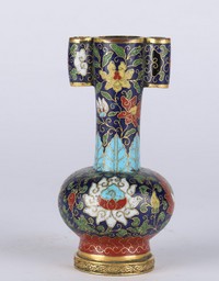 28 - CHINESE CLOISONNE BOTTLE VASE Chinese cloisonne enamel vase decorated with lotus blossoms and vines. Tubular handles to cylindrical neck. Marked to underside. Measures 6 3/4" x 2 3/4".
