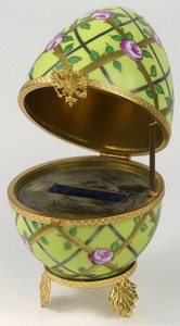 29 - FABERGE LIMOGES PORCELAIN EGG Faberge. French Limoges porcelain 'Rose Trellis' egg (number 268), modeled after the Easter egg of 1907. Measures 5 3/4" x 3 1/4" x 3 1/4". Note: missing surprise.