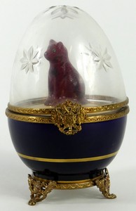 30 - FABERGE LIMOGES EGG w CAT SURPRISE Faberge Limoges egg. Crystal top and porcelain base. Cat surprise. Marked to underside. Measures 4" x 2 1/2" x 2 1/2".