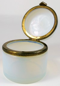 34 - ANTIQUE FRENCH OPALINE GLASS DRESSER BOX Antique French Opaline round glass box. Measures 4 3/4" x 4 3/4" X 4 1/2".
