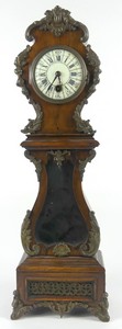 36 - ANTIQUE FRENCH MINIATURE GRANDFATHER CLOCK Antique French ormolu mounted miniature grandfather clock with mahogany case. Impressed 'F. Rouge' to underside. Measures 19" x 6" x 4 1/2".