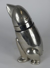 40 - POLAR BEAR CHROMED COCKTAIL SHAKER Mid-century silver plated cocktail shaker in the form of a polar bear. Head is removable to reveal strainer. Measures 10 1/4" x 7" x 5".
