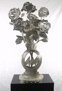 18 - BABETTE BLOCK 'ROSES' STEEL SCULPTURE Babette Bloch (American, b. 1956) laser cut steel sculpture depicting a vase of flowers / roses. Signed and numbered 1/9 to top of base. Sculpture measures 41" x 24" x 9 1/2". Includes pedestal measuring 36" x 22" x 10". Includes certificate of authenticity.