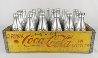 27 - ANDY WARHOL 'YOU'RE IN' PAINTED COCA COLA BOTTLES Twenty One (21) Andy Warhol spray painted Coca Cola glass bottles. One bottle initialed to top clip. Vintage yellow Coca Cola crate signed in black marker. Each bottle measures 8" x 2 1/4" x 2 1/4". Crate measures 18 1/4" x 12" x 5".