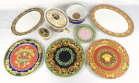 30 - 9pc VERSACE ROSENTHAL PORCELAIN ITEMS w BOXES Nine pieces of Versace Rosenthal porcelain including 3 plates (12" x 12), 2 oval serving platters (largest-16" x 11 1/2"), 1 covered vegetable (13" x 7" x 7"), 1 small dish, 1 round bowl, 1 small covered bowl. Each piece marked to underside. Includes 8 boxes (box for small covered bowl is not included).