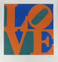 32 - ROBERT INDIANA 'LOVE' SIGNED LITHOGRAPH Robert Indiana 'Love' lithograph depicting red letters on a blue and green ground. Pencil signed lower right. Sheet measures 21 1/4" x 20".