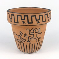 36 - KEITH HARING TERRA COTTA POT Keith Haring [attributed] black marker on terracotta flower pot. Depicts dancing figures with geometric designs. Signed and dated 1982 to underside. Measures 3 3/4" x 3 3/4" x 3 5/8".