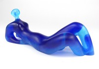 42 - DAUM PATE-DE-VERRE 'FEMME ALLONGEE' SCULPTURE Anne-Laure Capo Di Feltre for Daum Pate-de-Verre 'Femme Allongee' blue glass sculpture. Signed. Includes box. Figure measures 9 1/2" x 3 1/2" x 3".