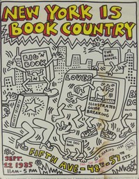 48 - KEITH HARING 'NEW YORK IS BOOK COUNTRY' SIGNED Keith Haring 'New York is Book Country' offset lithographic poster. Signed in red marker and dedicated to Jay Michael Craig lower right. Measures 25 1/4" x 19 1/2". Note: stained, see photos.