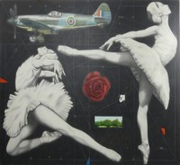 4 - JOSEPH PICCILLO 'BALLERINAS, AIRPLANE, ROSE' Joseph Piccillo (American, b. 1941) mixed media painting on canvas depicting two ballerinas, airplane and rose. Measures 72" x 60" x 1".