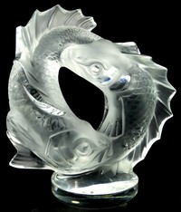 50 - LALIQUE CRYSTAL 'DEUX POISSONS' KOI FISH SCULPTURE Lalique 'Deux Poissons' (Double Fish) French frosted crystal sculpture. Signed to base. Measures 11 1/2" x 10 1/2" x 6".
