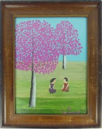 5 - THEORA HAMBLETT OIL PAINTING ON BOARD Oil painting on canvas board depicting a landscape after Theora Alton Hamblett. Depicts two trees with pink foliage and two seated figures. Signed lower right. Holds label to verso. Viewable measures 11 3/4" x 8 3/4". Frame measures 14 7/8" x 11 7/8" x 1 1/4".
