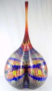 8 - STEPHEN ROLFE POWELL 'TEASING BUNS' GLASS VESSEL Stephen Rolfe Powell 'Untitled' from the Teasers series large two-loved multi-colored vessel, with multiple bands of colored canes of different sizes and shapes. Signed, dated 1977 and marked LX. Measures 44" x 24" x 12".