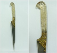 10 - ROCK CRYSTAL RAM HEAD HANDLE MUGHAL DAGGER Mughal dagger with rock crystal handle has ruby stone eyes and is carved in form of a ram. Blade has damascus work and beautiful gold gilt motif below handle. Measures 12" (30.48cm) total length & 3 1/2" (8.89cm) length of only handle. Total weight 122g.