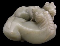 13 - CHINESE WHITE & RUSSET JADE CARVIING OF FOO LIONS Chinese white & russet jade carved foo lion groups with turtle. Measures 6" (15.24cm) length by 4"(10.16cm) width, total weight 976.3g.