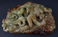 45 - CHINESE YELLOW & RUSSET JADE CHI DRAGON PENDANT Chinese yellow & russet jade carved chi dragon pendant. Measures 2 1/4" (5.71cm) height by 2' (5.08cm), total weight 54.2g.