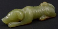 15 - CHINESE YELLOW & RUSSET JADE RECUMBENT DOG Chinese yellow & russet jade carved recumbent dog. Measures 3" (7.62cm) by 3/4" (1.90cm) width, total weight 49.8g.