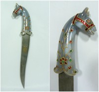 16 - JEWELED AGATE HANDLE HORSE HEAD MUGHAL DAGGER Rare Mughal jeweled horse dagger with semi precious stones inlaid into the fine agate handle. Measures 15" (38.1cm) total length. Total weight 443g.