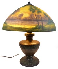17 - CLASSIQUE REVERSE PAINTED BRONZE TABLE LAMP Classique 8317 Art Nouveau style lamp. Shade is a beautiful reverse hand painted landscape scene. The shade has a canvas textured exterior surface giving the painting a much softer look. The textured bronze lamp base has a hammered look finish and also features a intertwined motif band to center and lower rim. Made in Chicago, Illinois, circa 1910. Signed on the inner rim of the lamp shade "Classique 8317" . Measures 21 3/4" (55.2cm) height by 18" (45.7cm) diameter of lamp shade.