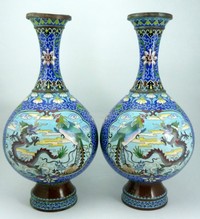 1 - PAIR CHINESE CLOISONNE ENAMELED BRONZE VASES Pair of Chinese antique cloisonne enameled bronze vases depicting dragons & a phoenix fighting in the clouds. Deep blue ground with floral motifs throughout. Measures 16" (40.64cm) height by 7" (17.78cm) width at largest point. Total lot weight 3094.6g.