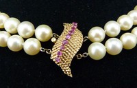 20 - SAPPHIRE 14k BROOCH w DOUBLE STRAND PEARL NECKLACE Cultured double strand pearl & 14k gold necklace, with a beautiful 14k yellow gold clasp with a row of pink sapphires. Marked "14k" & "A B & F" on clasp. Measures 17" (43cm) length, total weight 78g.