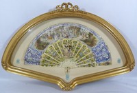 20a - ANTIQUE FRENCH HAND PAINTED ENCASED FAN Antique French hand painted encased fan. Carved bone structure and carved Howlite accents. Measures with case 30" (76cm) width by 20" (51cm) height.
