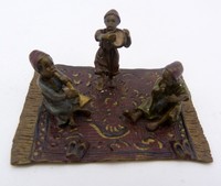 21 - BERGMAN VIENNA BRONZE OF CHILDREN ON CARPET Bergmann Vienna cold painted bronze of children on carpet playing music, possibly Arabic or blackamoor children, holds makers mark to bottom. Measures 3" (7.62cm) width by 2" (5.08cm) depth by 1 1/2" (3.81cm) height, total weight 90.8g.