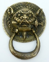 22 - CHINESE ANTIQUE BRONZE BEAST DOOR KNOCKER Chinese antique bronze beast / foo lion door knocker with Chinese calligraphy on the knocker. Measures 7" (17.78cm) height by 5" (12.7cm), total weight 292.2g.
