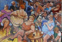 23 - BARRY LEIGHTON JONES "WOMEN IN LOVE" OIL PAINTING Barry Leighton Jones "women in love" original oil painting on canvas depicting men & women drinking at a bar. Measures 67" (170cm) length by 48" (122cm) height. Signed in lower left corner.