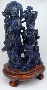 24 - LARGE CHINESE CARVED LAPIS QUAN YIN SCULPTURE Large Chinese lapis Quan Yin carving. Measures 18" (46cm) height by 11" (28cm) width.