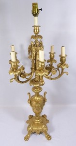 25 - FRENCH DORE BRONZE LARGE TABLE CANDELABRA LAMP Antique very ornate French dore bronze large table candelabra lamp with claw feet and lion heads on base. There are ornate faces to the center of the lamp and the top of the lamp is covered with a floral and garland decoration. Measures 36" (91.44cm) height by 17" (43.18cm) width, total weight 15.10kg.