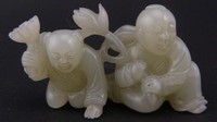 29 - CHINESE WHITE JADE CARVING OF BOYS HOLDING LOTUS Important Chinese white jade carved sculpture of two boys holding lotus flowers. Measures 2 1/2" (6.35cm) width by 1 1/4" (3.17cm) height, total weight 41.5g.