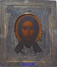 2 - RUSSIAN ANTIQUE 84 SILVER ICON OF CHRIST Russian antique 84 silver over hand painted icon of Jesus Christ on wood plaque. Enameled name plate on bottom and below that holds the makers and purity marks on the rim of the silver face. Makers marks appear to be from Moscow 1908-1926 (P-L # 3887) silversmith Nikolai Pavlovich Pavlov. Measures 12" (30.48cm) height by 11" (27.94cm) width, total weight 1170.7g.