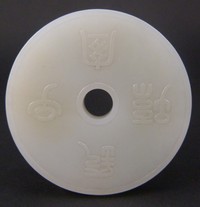 30 - CHINESE WHITE JADE BI DISK w CALLIGRAPHY CARVING Chinese white jade carved bi disk with calligraphy in high relief. Measures 2 1/4" (5.71cm) diameter, total weight 45.2g.