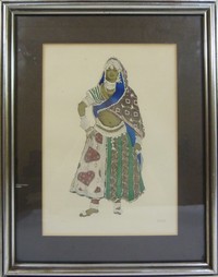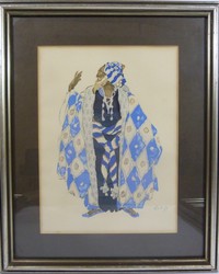 36 - LEON BAKST WATERCOLOR OVER PENCIL COSTUME STUDY Léon Samoilovitch Bakst (Russian, 1866 - 1924) original signed Costume Study watercolor over pencil. Signed lower right. Measures 11 1/2" (29.21cm) height by 8 1/2" (21.59cm) width plus 2 1/2" (6.35cm) matte & frame.