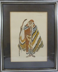 33 - LEON BAKST WATERCOLOR OVER PENCIL COSTUME STUDY Léon Samoilovitch Bakst (Russian, 1866 - 1924) original signed Costume Study watercolor over pencil. This drawing is St. Sebastian dated 1922. Signed lower right. Measures 11 1/2" (29.21cm) height by 8 1/2" (21.59cm) width plus 2 1/2" (6.35cm) matte & frame.