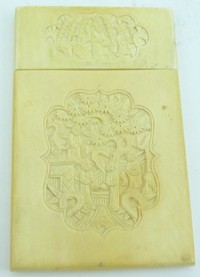 40 - ANTIQUE CHINESE CARVED IVORY CARD CASE Antique Chinese carved ivory card case depicting a highly detailed carving of a village scene in high relief. Measures 4 1/4" (11cm) height by 2 3/4" (7cm) width, total weight 55g. NOTE: There is no International shipping allowed on this lot. This lot can be sold exclusively to residents of the state of Florida and cannot be shipped outside of the state.