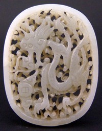 44 - CHINESE PIERCED WHITE JADE DRAGON ORNAMENT Chinese pierced white jade carved dragon ornament / pendant. Measures 2 1/2" (6.35cm) width by 2" (5.08cm) height, total weight 43g.