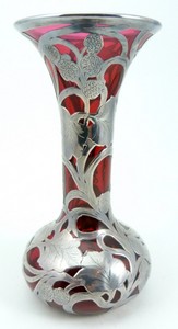 4 - 1906 STERLING SILVER OVERLAY CRANBERRY GLASS VASE Antique cranberry sterling silver overlay vase. Engraved Luanstuck Yacht Club, Association Race, Aug 4, 1906 Class "BB." Measures 7" (17.78cm) height by 3 1/2" (8.89cm) width, total weight 482.3g.