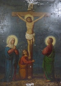 5 - 17TH/18TH CENTURY "CRUCIFIXION" PAINTING ON METAL Circa 17th - 18th century signed icon painting on metal of the crucifixion of Jesus Christ. Signed to lower right but cannot identify artist name. Believed to be Italian. Measures approx 12" (30.48cm) height by 10" (25.4cm) width.