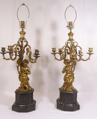 6 - BRONZE PUTTI FIGURAL CANDELABRA LAMPS Pair of bronze & marble cherub candelabra lamps. Possibly French or Italian and late 19th to early 20th century. Each measures 35" (88.9cm) height by 8" (20.32cm) width. Total weight approx 25kg.