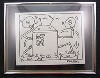 7 - KEITH HARING "THE DJ" 1984 MARKER/INK ON PAPER Attributed to Keith Haring "The DJ" 1984 marker / ink drawing on paper. Measures 11 1/2" (29.21cm) height by 9" (22.9cm) plus 2" (5cm) frame.