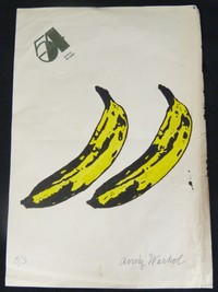 10 - ANDY WARHOL HAND PAINTED & SIGNED BANANAS Attributed to Andy Warhol hand painted "The Velvet Underground" bananas on studio 54 letterhead paper. Signed in pencil to lower right. Measures 12" (30cm) height by 9" (23cm) width.