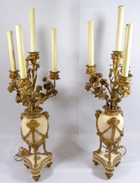 16 - PAIR ANTIQUE BRONZE/MARBLE FLORAL PUTTI LAMPS Pair of antique French bronze and marble floral putti lamps. Measures 29' (74cm) height by 9" (23cm) width.