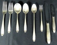 20 - 47pc WALLACE SIR CHRISTOPHER STERLING FLATWARE 47 pieces Wallace Sir Christopher sterling silver flatware set. Includes 8 teaspoons, 8 soup spoons, 7 salad forks, 8 dinner forks, 8 butter knives and 8 dinner knives. Total sterling weight 50ozt. Forks and spoons 43.6ozt plus approx 6.4ozt sterling for the knives. Approx 0.5ozt for each dinner knife and 0.3ozt for each butter knife.