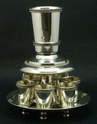 19 - STERLING SHABBAT WINE FOUNTAIN w SIX KIDDISH CUPS Sterling silver Shabbat Kiddush six cup wine fountain. The fountain cascades into the six small cups below. Measures 9" (23cm) height by 7" (18cm) width, total weight 20 ozt.